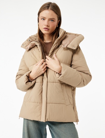 Rahat Kalıp Fermuarlı Kapüşonlu Kapitoneli Dik Yaka Şişme Mont Sepete Ekle