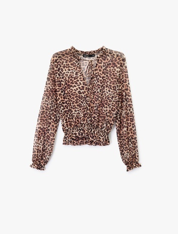 Rahat Kalıp Uzun Kollu Gipeli Bağlamalı Yaka Leopar Desenli Tül Bluz Sepete Ekle