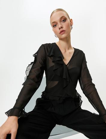 Şifon Transparan Bluz Fırfırlı V Yaka Uzun Kollu