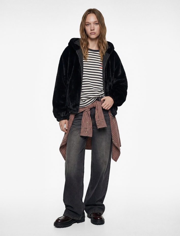 Kapüşonlu Fermuarlı Suni Kürk Ceket
