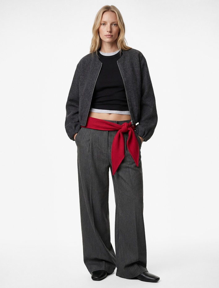 Kaşe Bomber Ceket Crop Bisiklet Yaka Fermuarlı Cepli Uzun Kollu