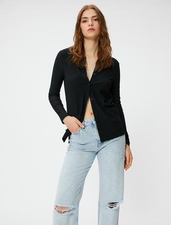 Düğmeli Uzun Kollu Klasik Yaka Krep Gömlek