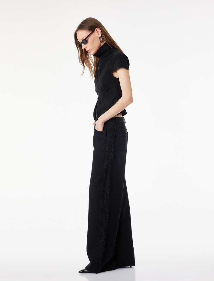 Pamuklu Dantel Detaylı Geniş Paça Denim Pantolon -  Wide Leg Jeans Sepete Ekle
