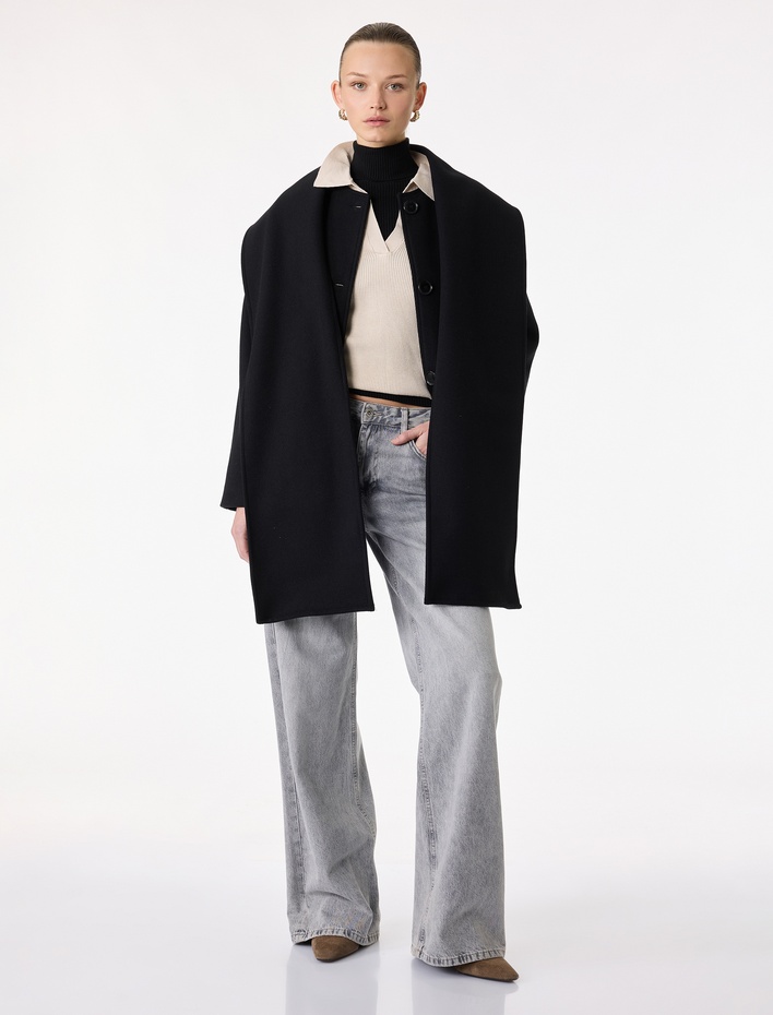 Uzun Kollu Cepli Düğmeli Kaşe Oversize Kaban