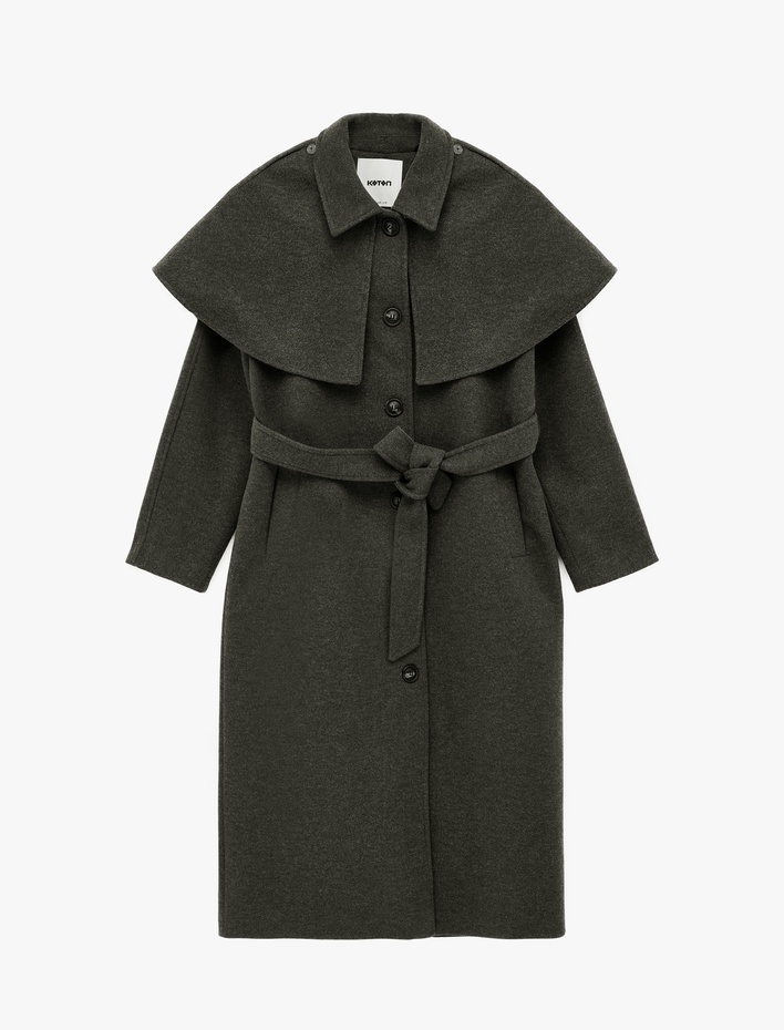 Çıkarılabilir Pelerin Yaka Kaşe Kaban Kemerli Uzun Kollu Düğmeli Cepli Sepete Ekle