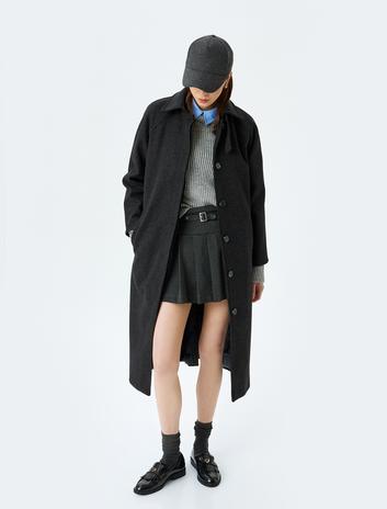 Kemerli Düğmeli Klasik Yaka Cep Detaylı Astarlı Kaşe Kaban