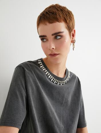 Yakası Taşlı Tişört Kısa Kollu Bisiklet Yaka Soluk Efektli Rahat Kalıp Sepete Ekle