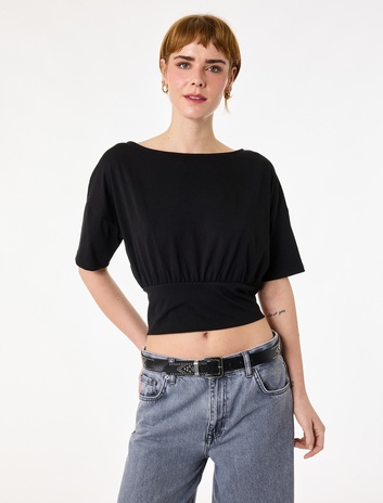 Kısa Kollu Viskon Karışımlı Kayık Yaka Crop Tişört Sepete Ekle