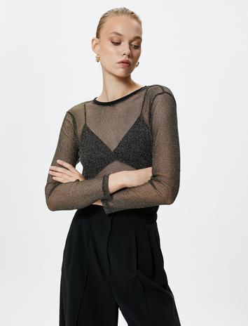 Transparan Tişört Simli Uzun Kollu Bisiklet Yaka Sepete Ekle