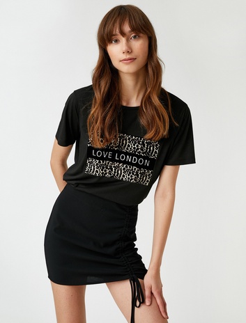 Taş Detaylı Yazı Baskılı Bisiklet Yaka Tişört Sepete Ekle