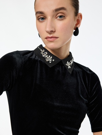 Kısa Kollu Klasik Yaka Taşlı Nakış Detaylı Kadife Tişört Sepete Ekle