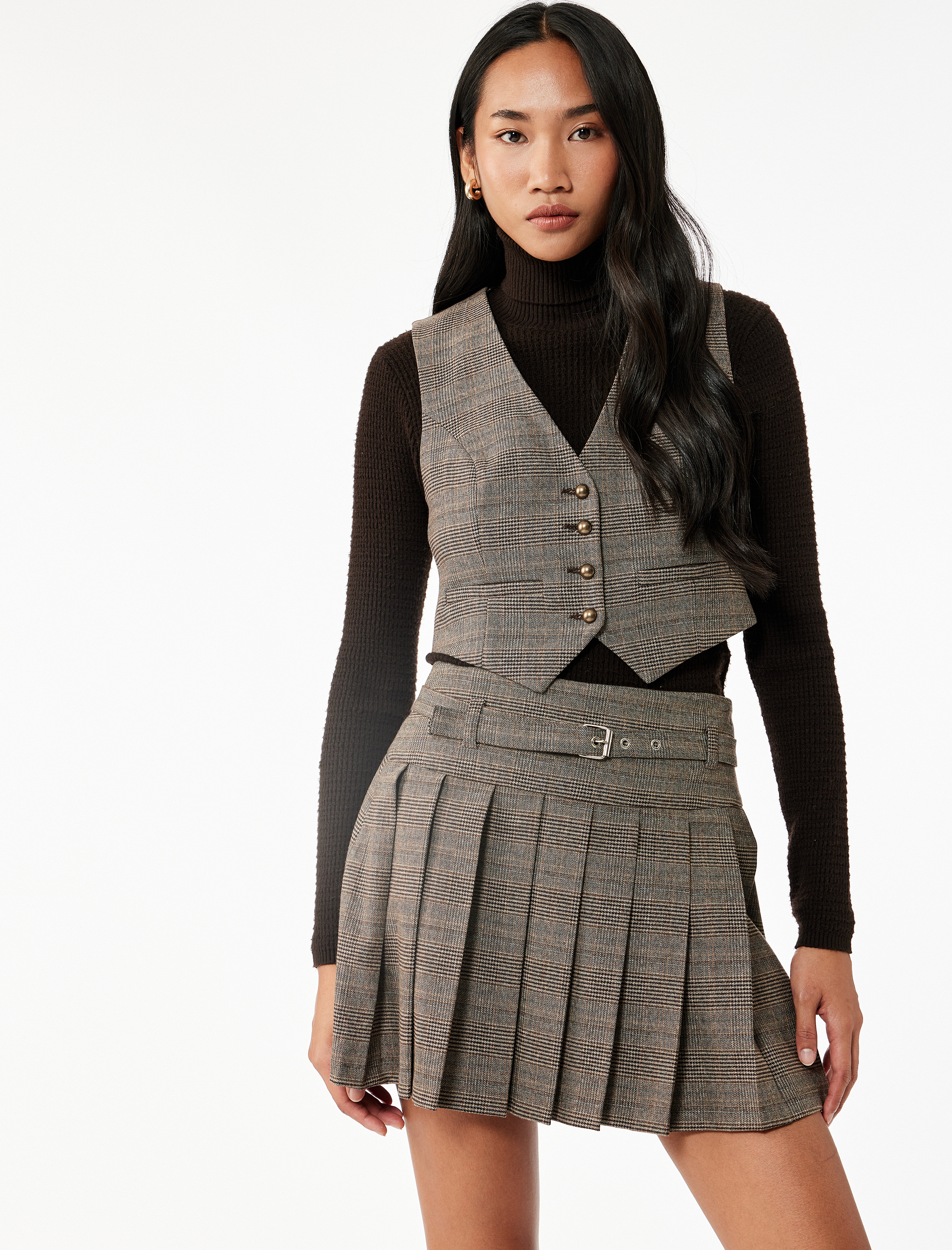 Slim Fit Düğmeli V Yaka Crop Ekose Blazer Yelek
