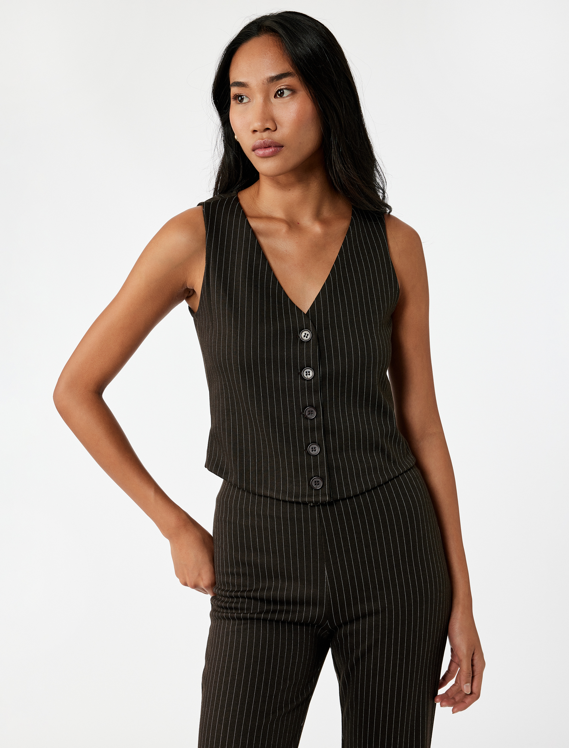 Slim Fit Düğmeli V Yaka Parıltılı Çizgili Yelek
