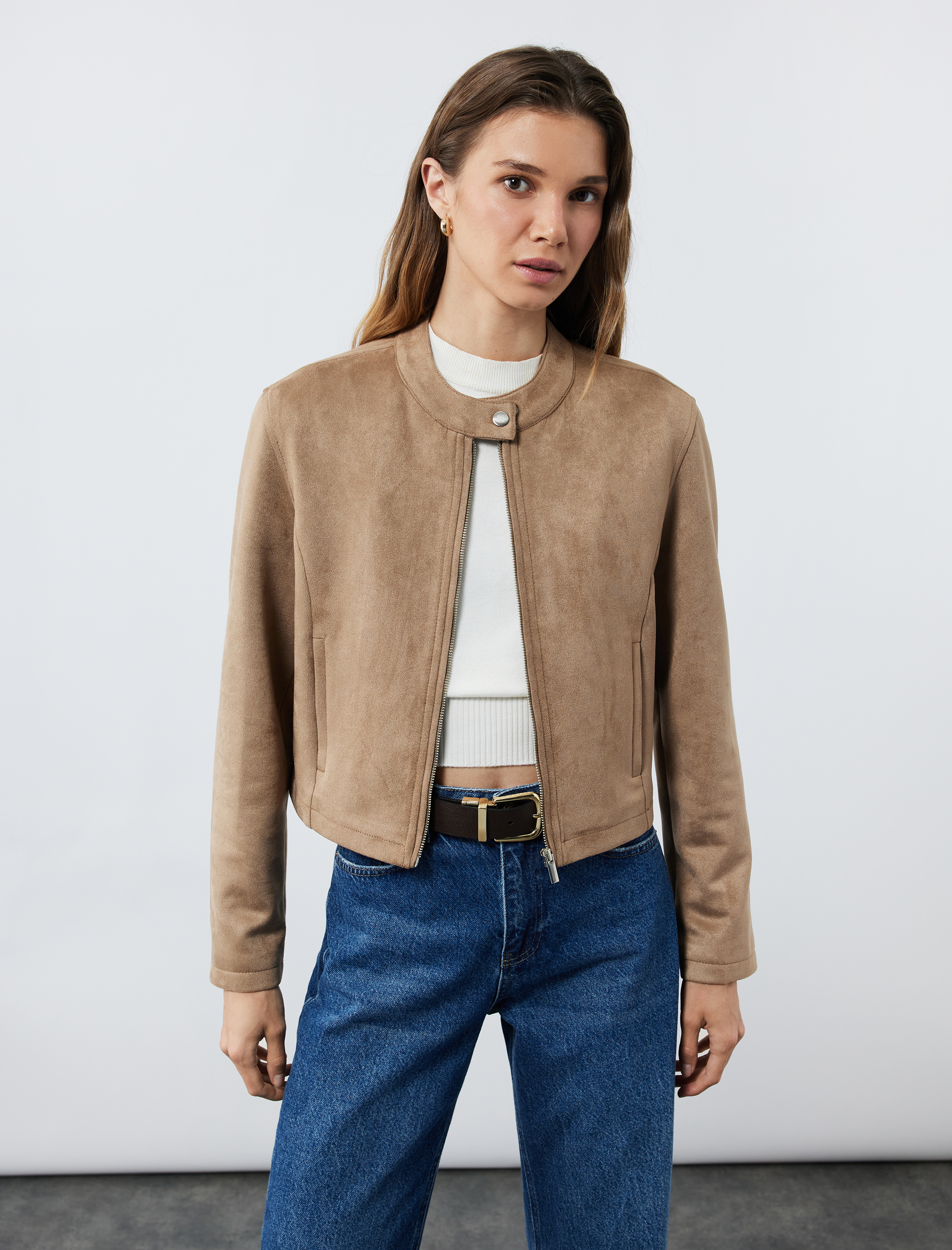 Slim Fit Fermuarlı Cepli Uzun Kollu Dik Yaka Suni Süet Ceket