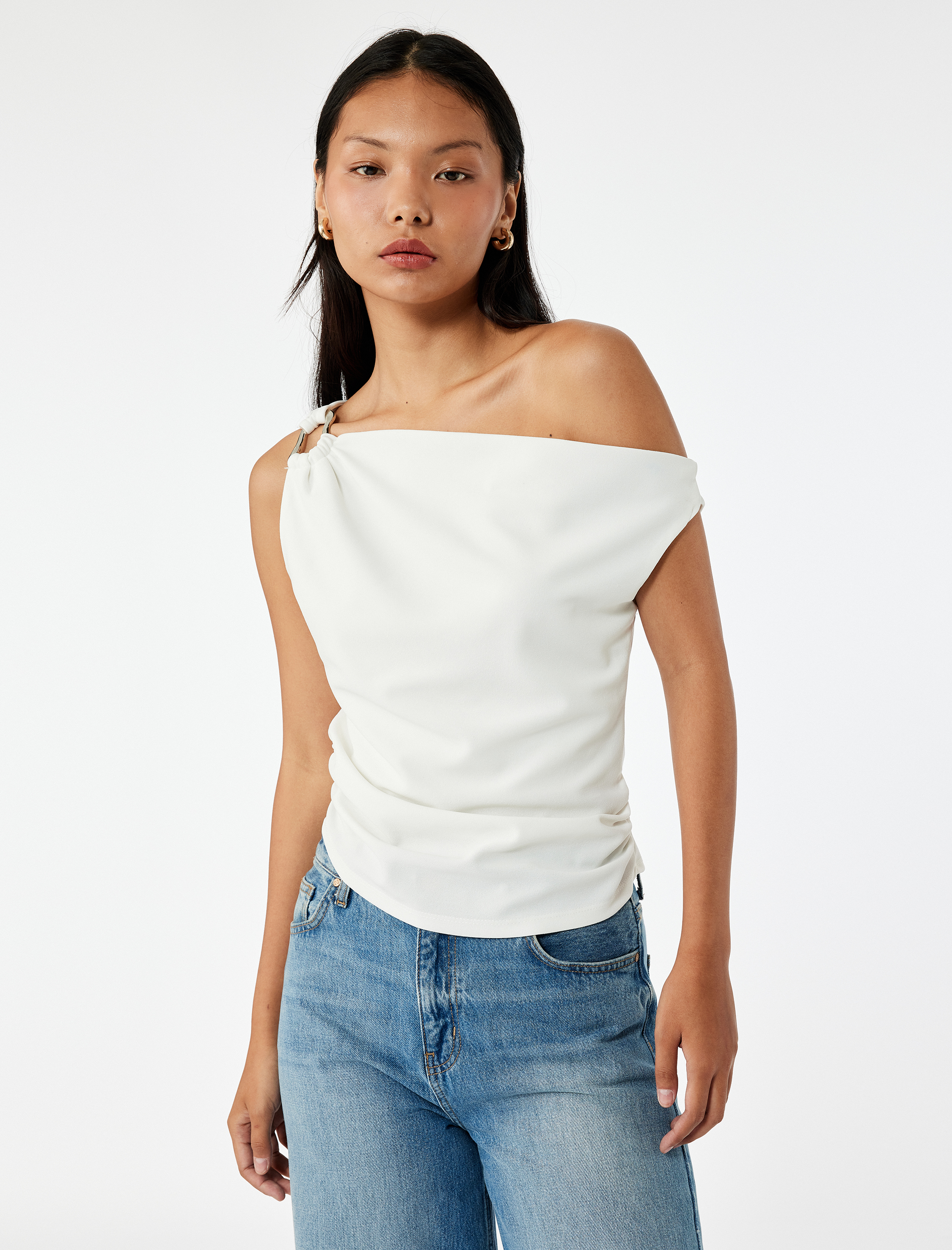 Slim Fit Metal Aksesuarlı Drapeli Asimetrik Yaka Kolsuz Bluz