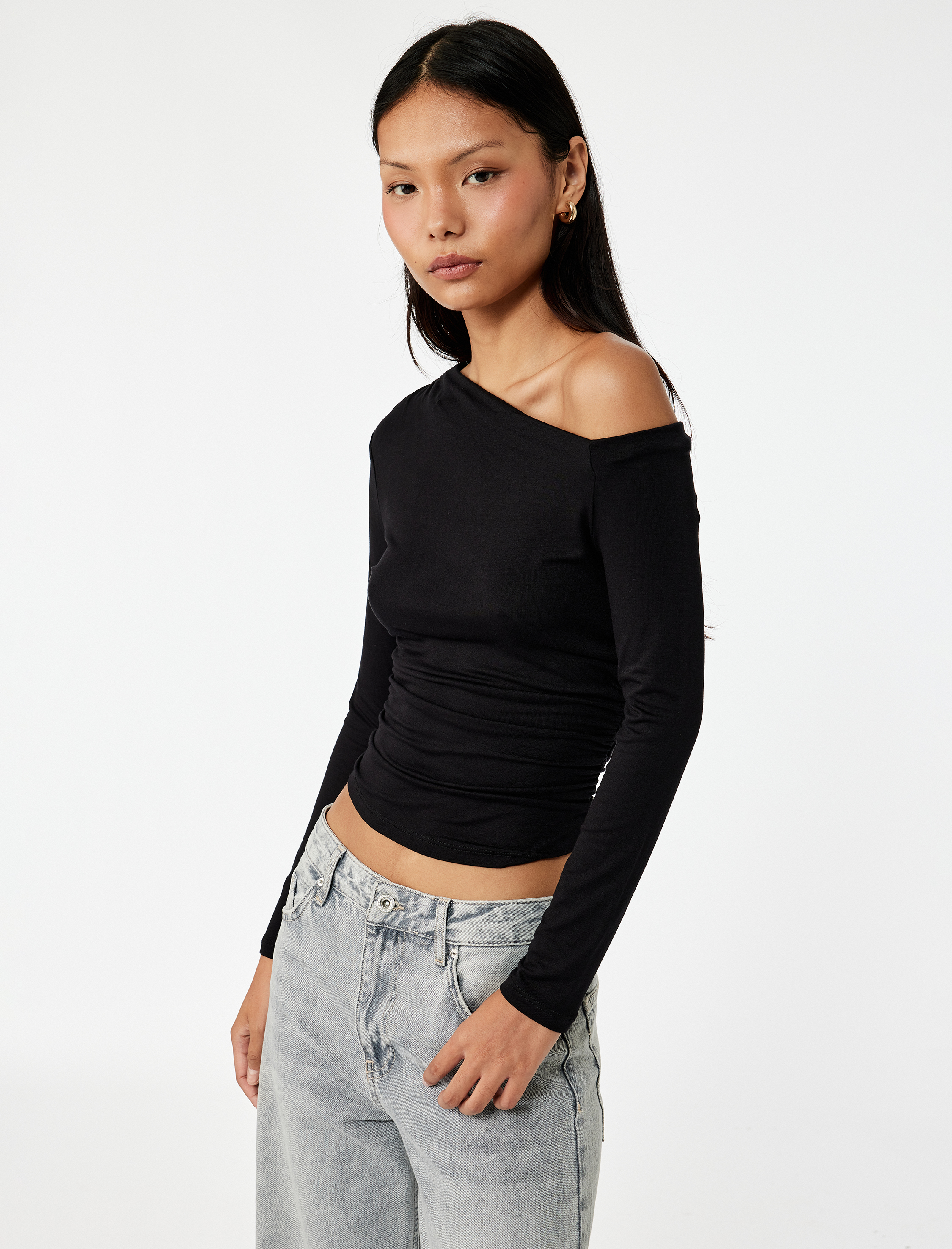Slim Fit Omzu Açık Uzun Kollu Viskon Drapeli Tişört