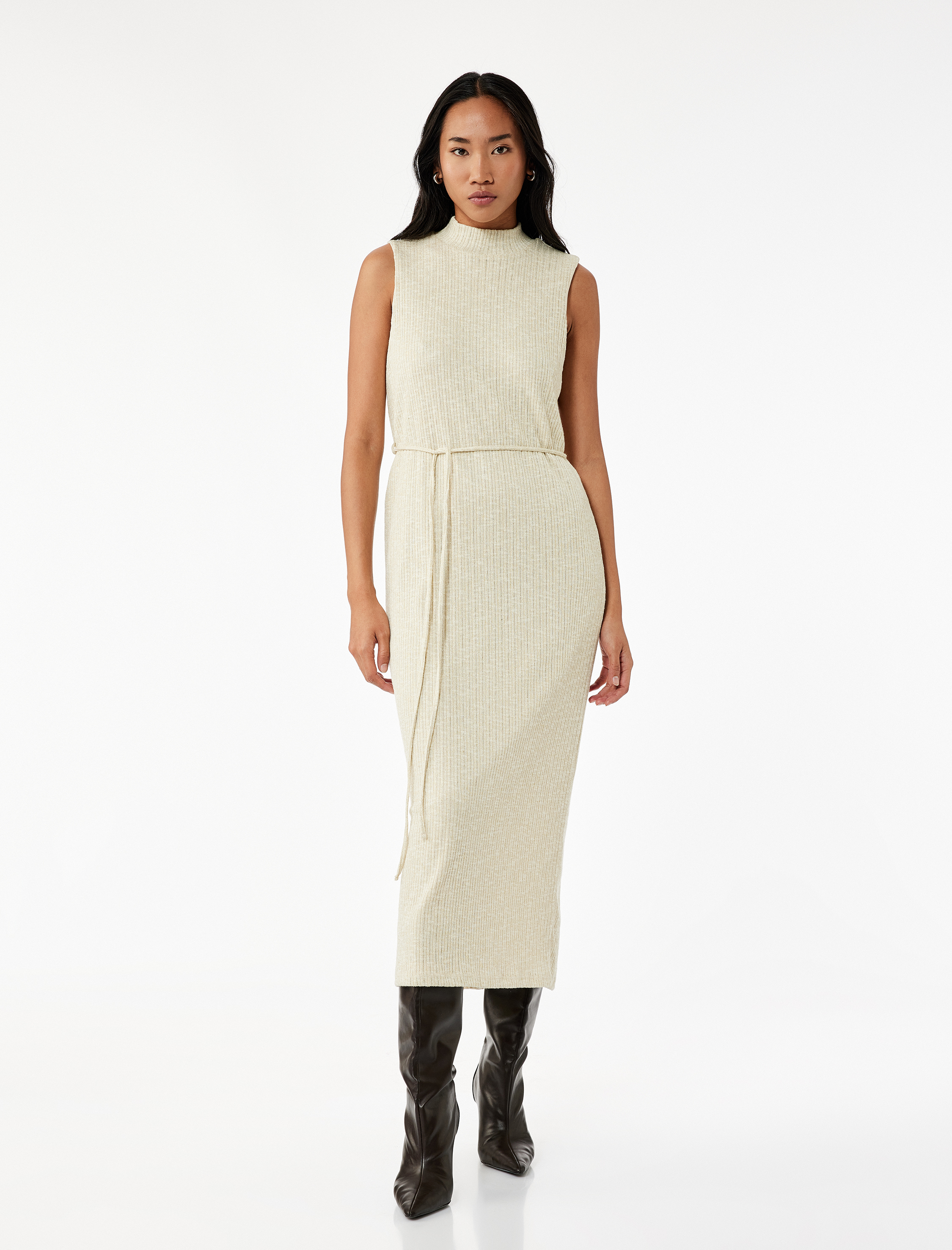 Slim Fit Parıltılı Kemerli Kolsuz Dik Yaka Midi Boy Kalem Elbise