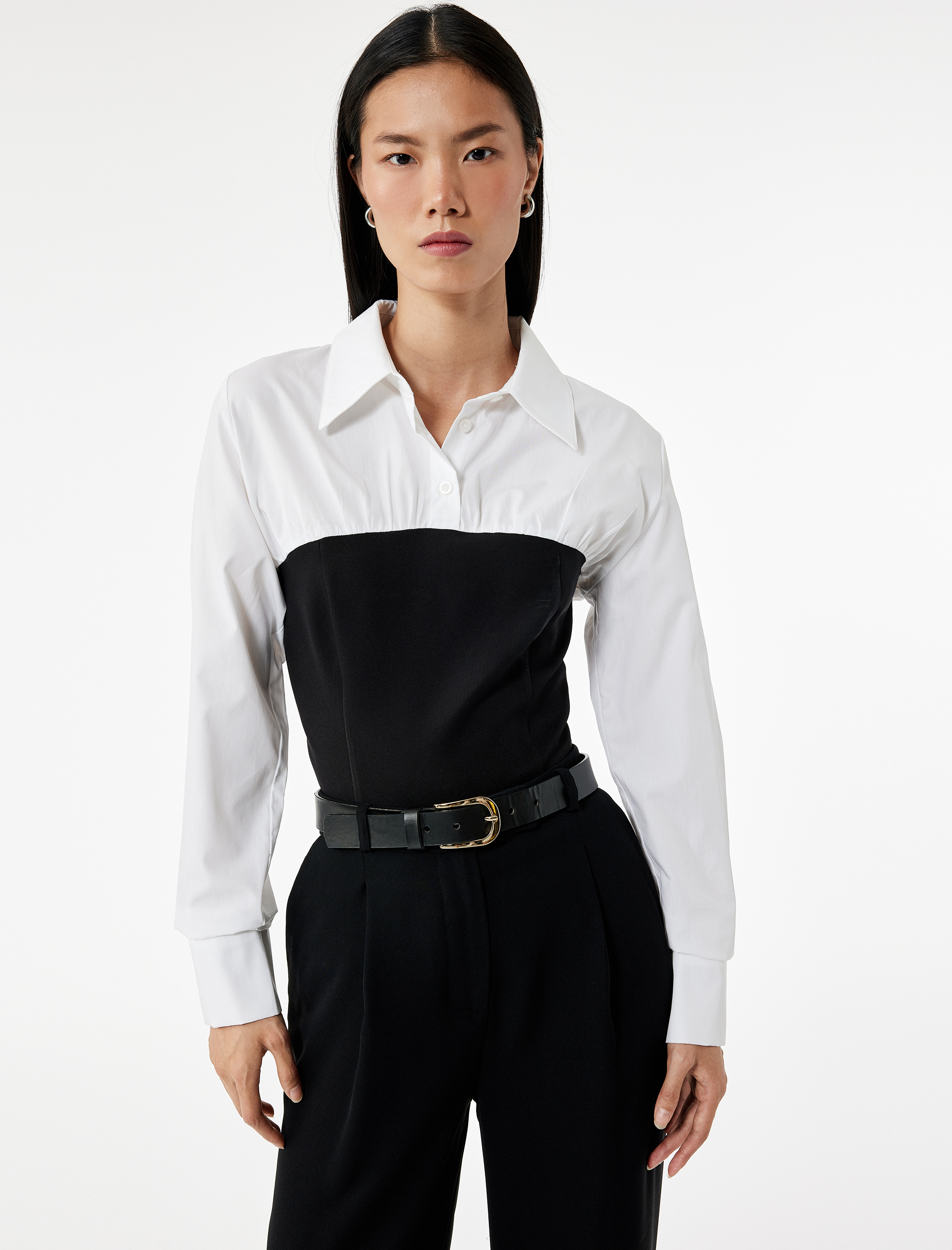 Slim Fit Uzun Kollu İki Farklı Kumaş Kullanımlı Korse Detaylı Gömlek