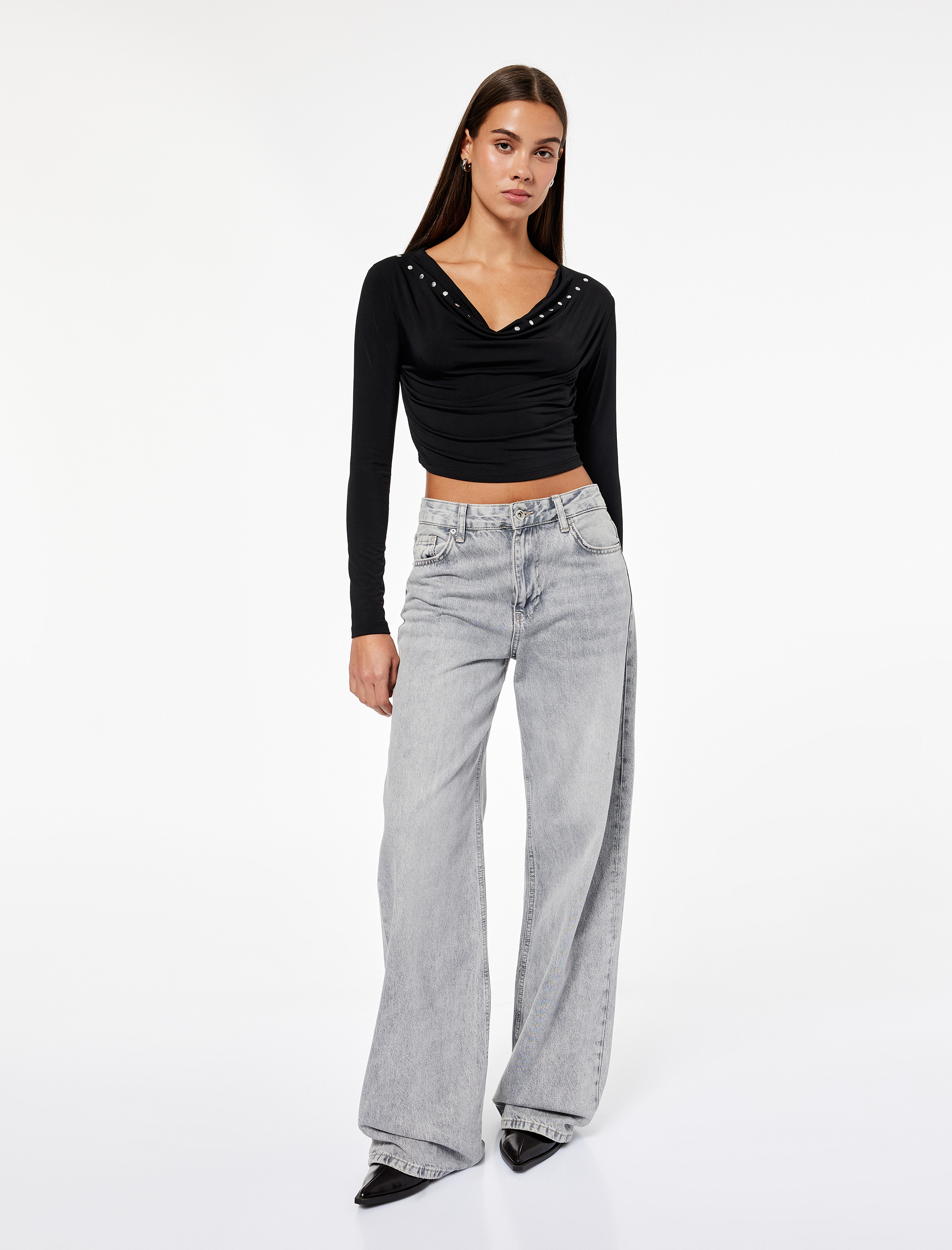 Slim Fit Uzun Kollu Metal Aksesuarlı Degaje Yaka Tişört