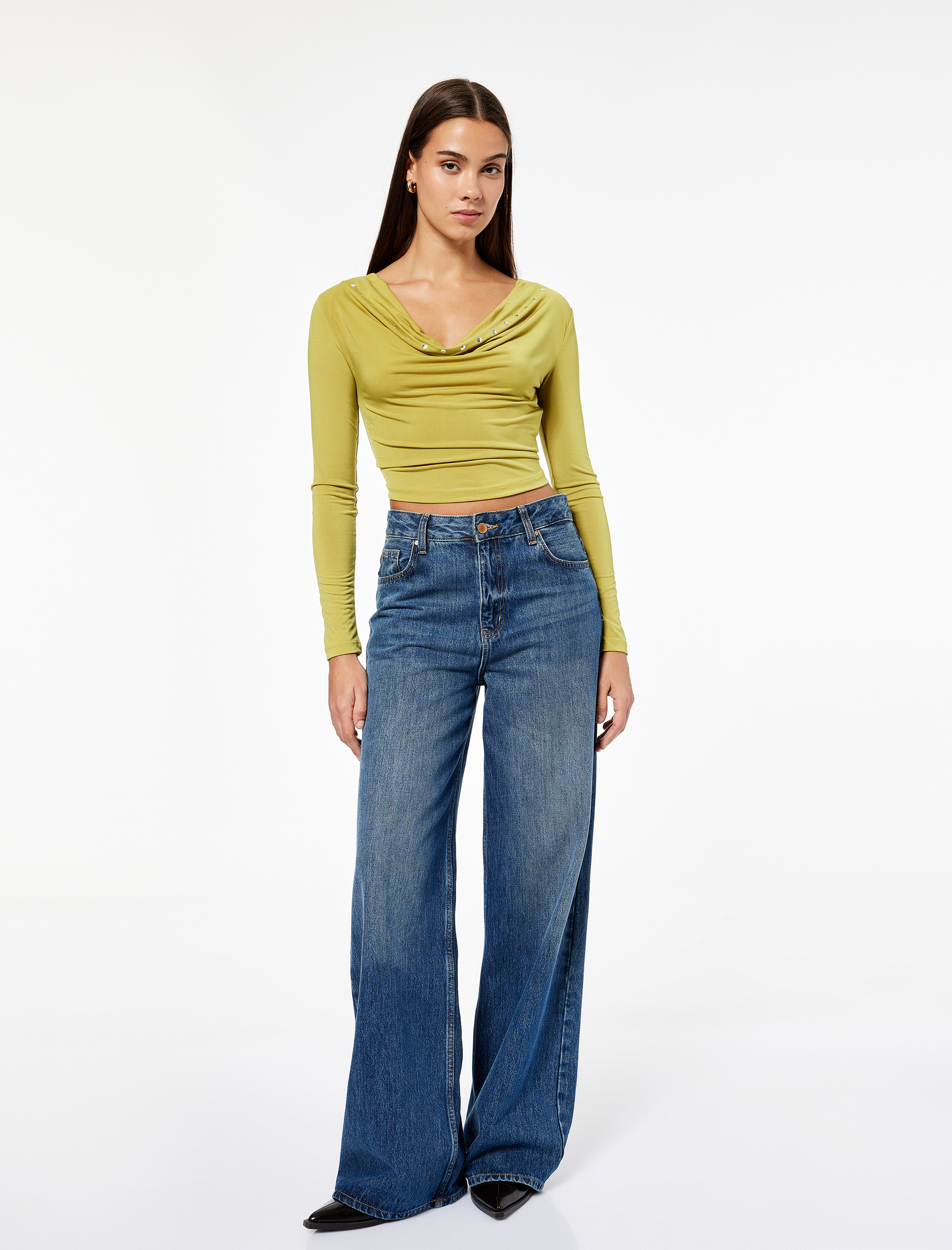 Slim Fit Uzun Kollu Metal Aksesuarlı Degaje Yaka Tişört
