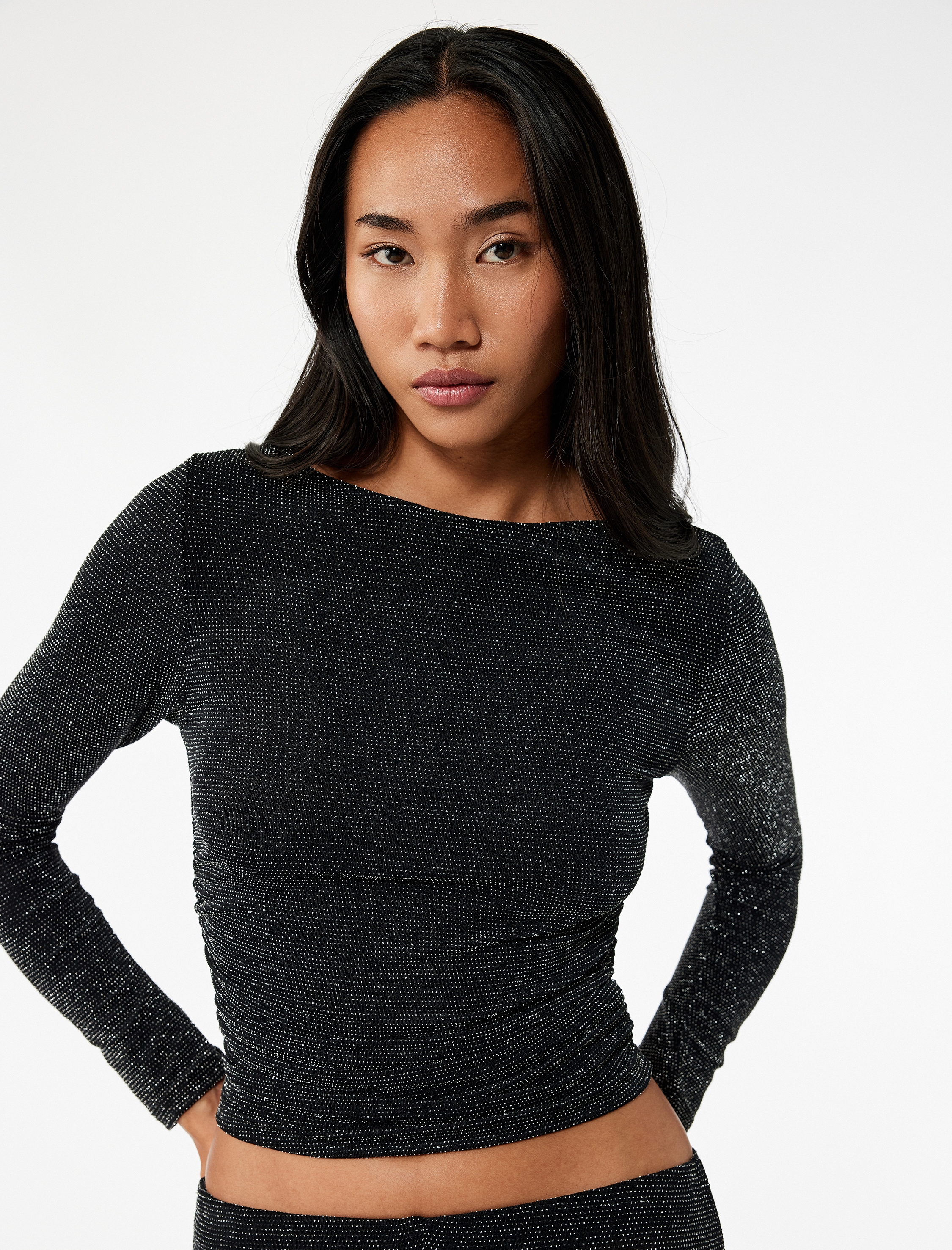 Slim Fit Uzun Kollu Yuvarlak Kayık Yaka Simli Tişört