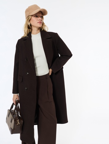 Uzun Kollu Dik Yaka Düğmeli Kruvaze Kaşe Ceket