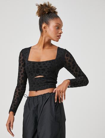 Uzun Kollu Tişört Crop Tül Kare Yaka Simli Pencere Detaylı Sepete Ekle