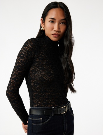 Slim Fit Uzun Kollu Dik Yaka Floral Dokulu Dantelli Bluz Sepete Ekle