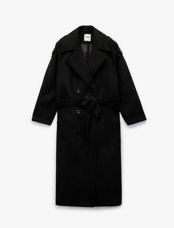 Uzun Kollu Cepli Kruvaze Düğmeli Kemerli Kaşe Kaban Sepete Ekle