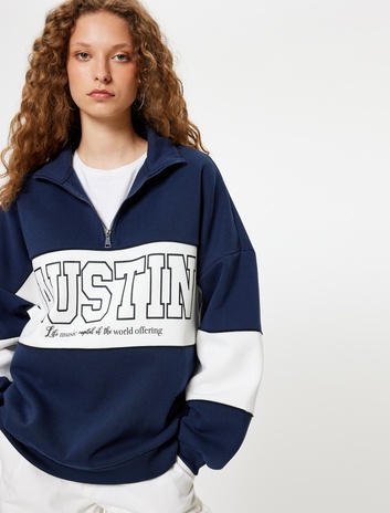 Oversize Sweatshirt Yarım Fermuarlı Kolej Baskılı Renk Bloklu Uzun Kollu Şardonlu Sepete Ekle