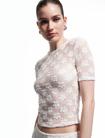 Crop Tül Tişört Kısa Kollu Çiçek Aplike Detaylı