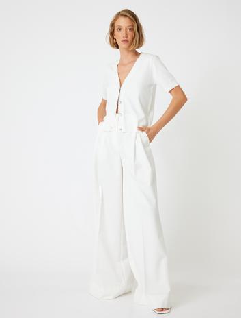 Yüksek Bel Kumaş Pantolon Düz Kısa Paça Yarım Kemer ve Pile Detaylı Sepete Ekle