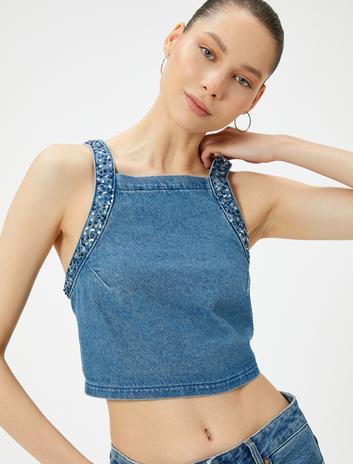 Taşlı Halter Yaka Kot Üst Arkası Dekolteli Fiyonk Bağlamalı Sepete Ekle