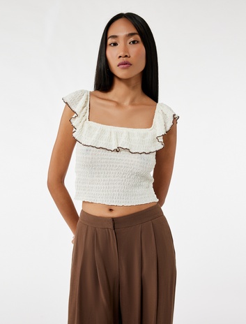 Bürümcük Kumaş Slim Fit Dokulu Omuz Açık Fırfırlı Bluz