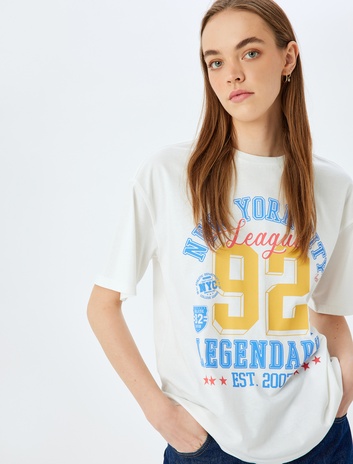 Kolej Baskılı Bisiklet Yaka Rahat Kalıp Kısa Kollu Tişört
