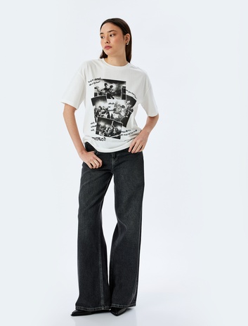 Baskılı Kısa Kollu Bisiklet Yaka Oversize Tişört