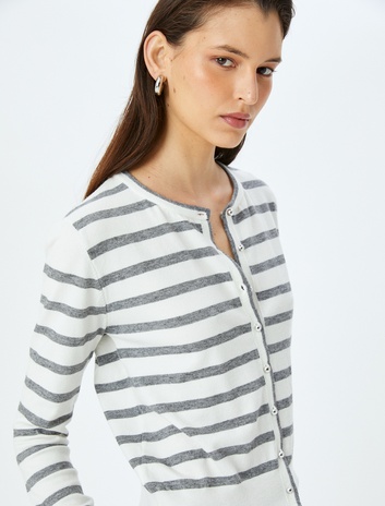 Düğme Detaylı Uzun Kollu Bisiklet Yaka Çizgili Hırka