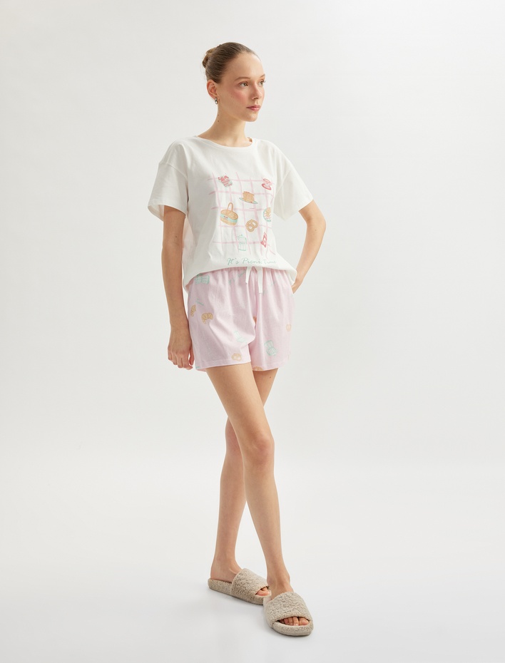 Baskılı Bisiklet Yaka Kısa Kollu Pamuklu Şortlu Pijama Takımı