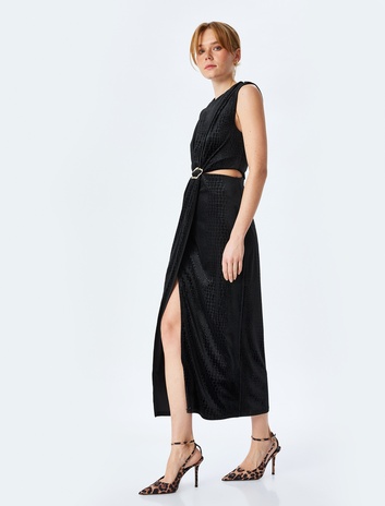 Metal Aksesuarlı Pencere Detaylı Kroko Görünümlü Uzun Elbise