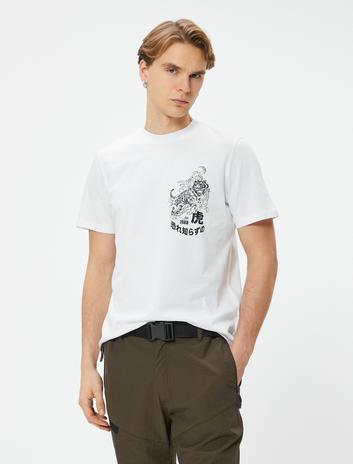 Uzakdoğu Baskılı Tişört Bisiklet Yaka Kısa Kollu Pamuklu