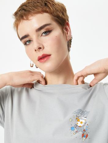 Baskılı Crop Tişört Kısa Kollu Bisiklet Yaka Pamuklu