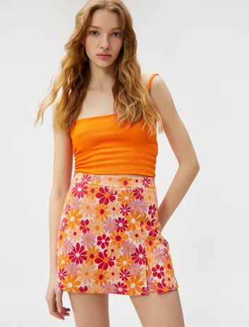 Mini Çiçekli Şort Etek Viskon Karışımlı Düz Kesim