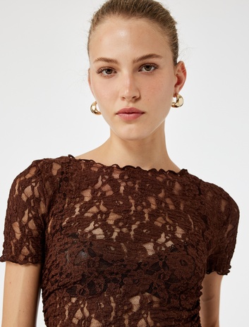 Yarı Transparan Kısa Kollu Yuvarlak Yaka Dantelli Tişört Sepete Ekle