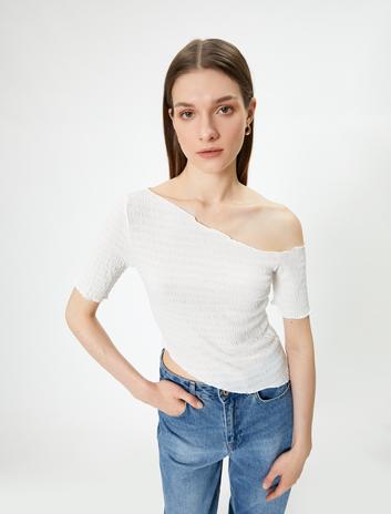 Tek Omuz Asimetrik Yaka Bluz Kısa Kollu Dokulu