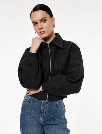 Fermuarlı Uzun Kollu Crop Bomber Kaşe Ceket