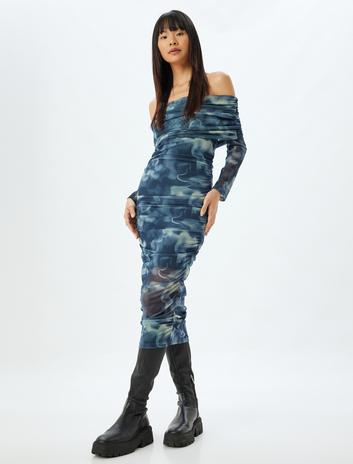Drapeli Omzu Açık Madonna Yaka Midi Tül Elbise