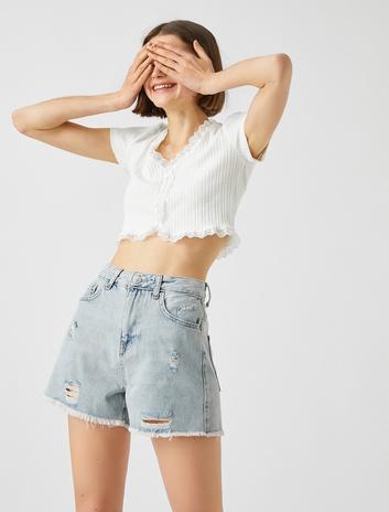 Crop Tişört Düğmeli Dantel Detaylı V Yaka