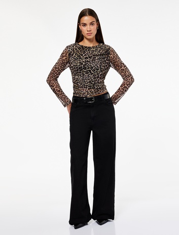Drape Detaylı Bisiklet Yaka Slim Fit Leopar Desenli Uzun Kollu Tişört Sepete Ekle