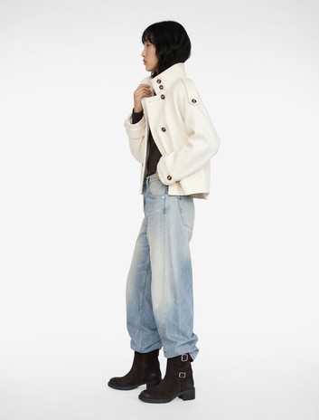 Uzun Kollu Cepli Düğmeli Kısa Kaşe Mont