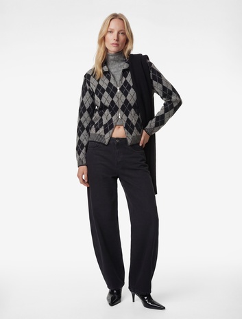 Düğmeli Uzun Kollu Bisiklet Yaka Kareli Triko Hırka